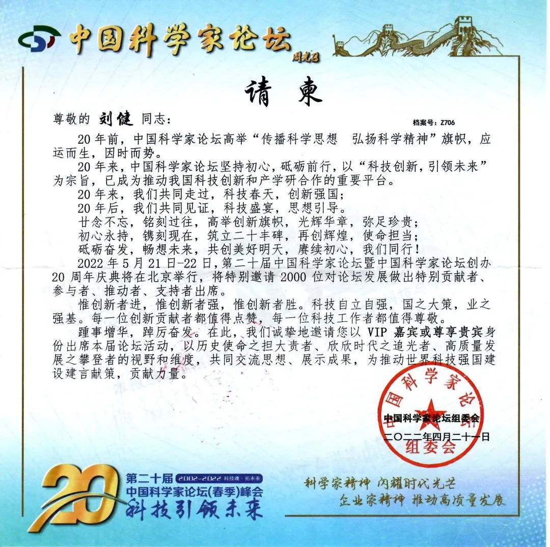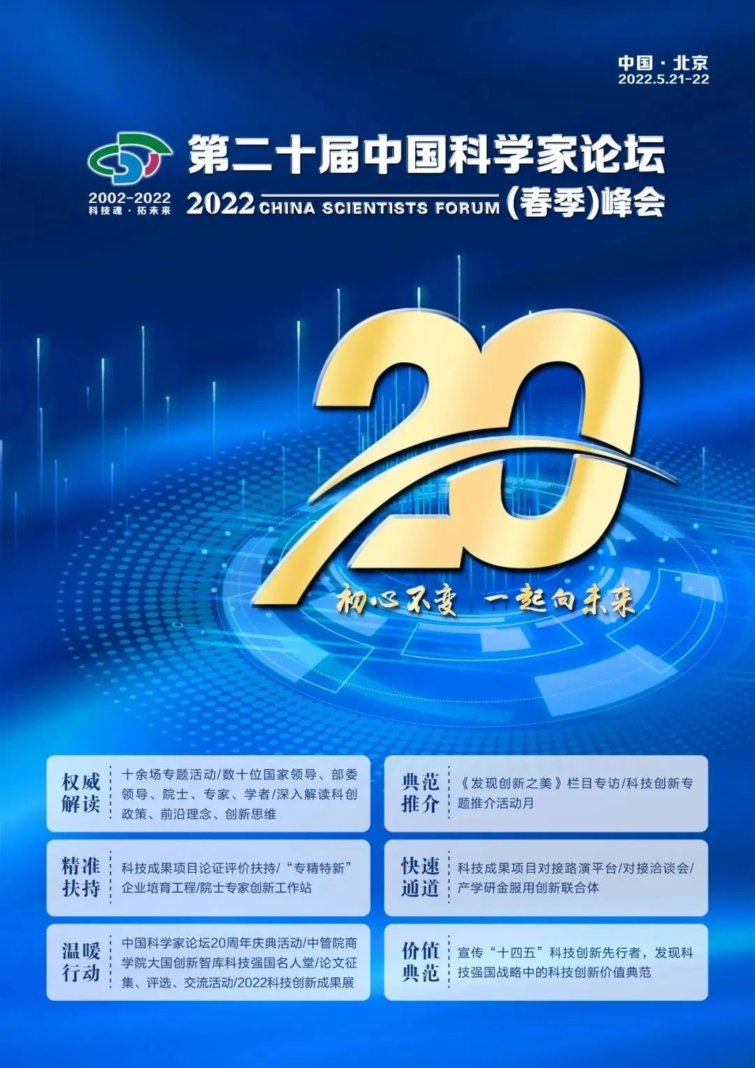 为贯彻落实2022全国两会精神及党中央国务院科技战略精神,凝聚奋进新征程的强大力量,以实际行动迎接党的二十大胜利召开,“第二十届中国科研家论坛(春季)峰会”将于2022年5月21-22日在北京召开,同期举行中国科研家论坛二十周年庆典活动。此次峰会主题为:科技创新赋能新时代高质量开展。‍